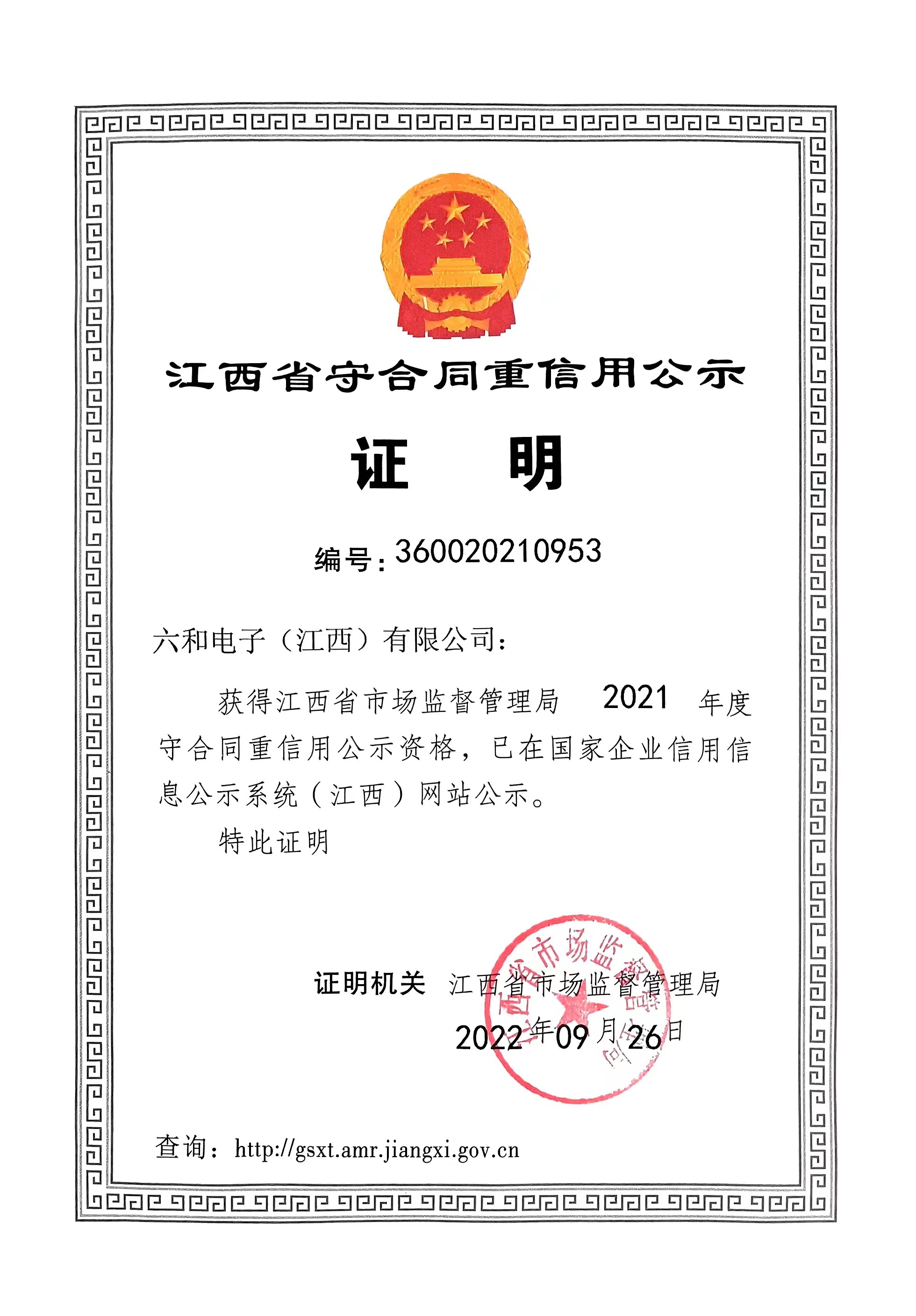 六和電子(江西)有限公司獲得江西省市場(chǎng)監(jiān)督管理局2021年度‘守合同重信用’企業(yè)公示證明。已在國(guó)家企業(yè)信用信息公司系統(tǒng)(江西)網(wǎng)站公示。公司已經(jīng)連續(xù)被認(rèn)定為省“守合同重信用”企業(yè)。 守合同重信用一直是六和電子的信譽(yù)基石,自成立以來(lái)獲得客戶、供應(yīng)商、政府單位的認(rèn)可。六和電子秉承守合同重信用理念,做大做強(qiáng),與各相關(guān)方發(fā)展共贏。