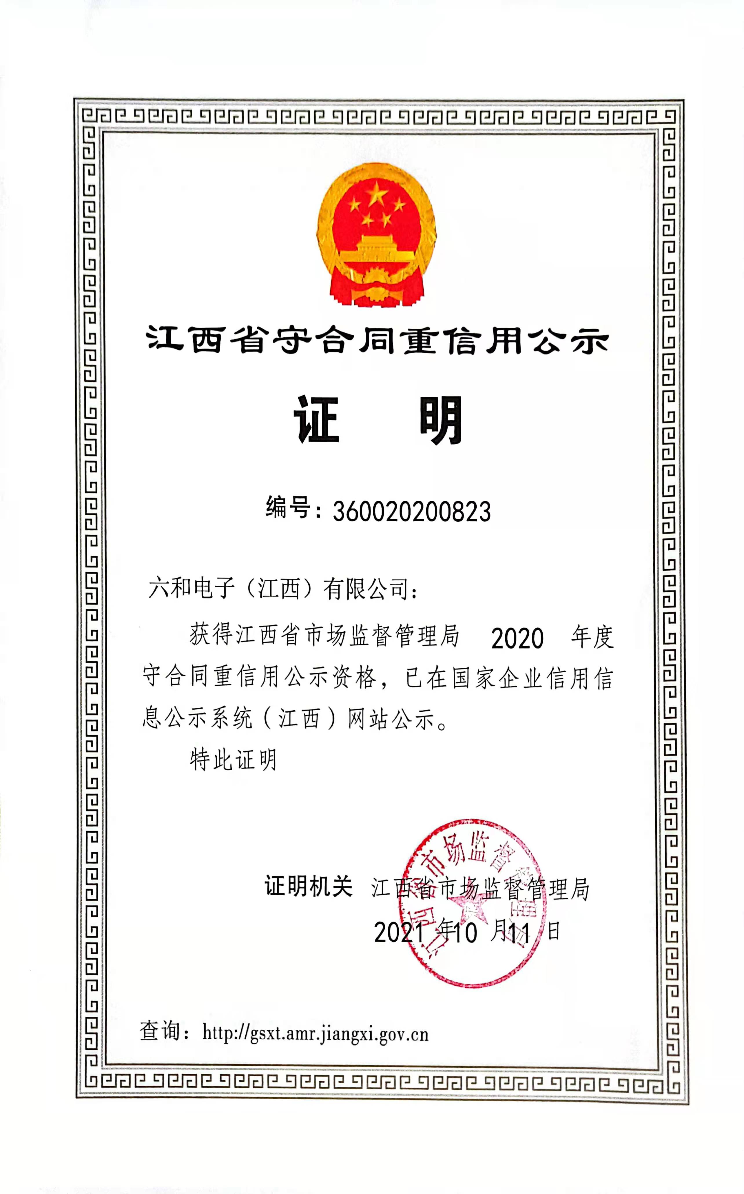 六和電子(江西)有限公司獲得江西省市場監(jiān)督管理局2020年度‘守合同重信用’企業(yè)公示證明。已在國家企業(yè)信用信息公司系統(tǒng)(江西)網(wǎng)站公示。公司已經(jīng)連續(xù)被認(rèn)定為省“守合同重信用”企業(yè)。 守合同重信用一直是六和電子的信譽(yù)基石,自成立以來獲得客戶、供應(yīng)商、政府單位的認(rèn)可。六和電子秉承守合同重信用理念,做大做強(qiáng),與各相關(guān)方發(fā)展共贏。